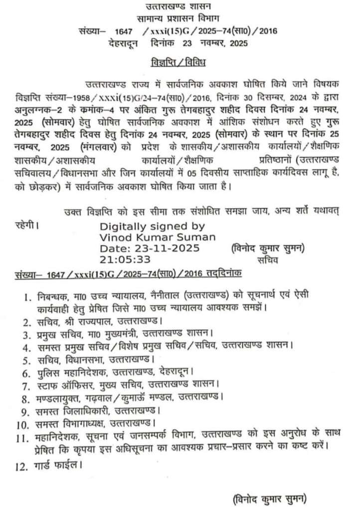 समाचार सच, देहरादून। उत्तराखण्ड शासन के सामान्य प्रशासन विभाग ने आज महत्वपूर्ण आदेश जारी करते हुए गुरु तेगबहादुर शहीद दिवस पर घोषित सार्वजनिक अवकाश की तिथि में संशोधन कर दिया है। पहले यह अवकाश 24 नवम्बर 2025 (सोमवार) को निर्धारित था, लेकिन अब इसे संशोधित करते हुए 25 नवम्बर 2025 (मंगलवार) कर दिया गया है।