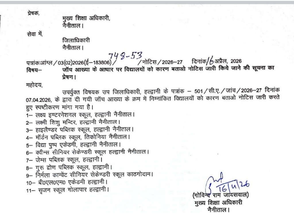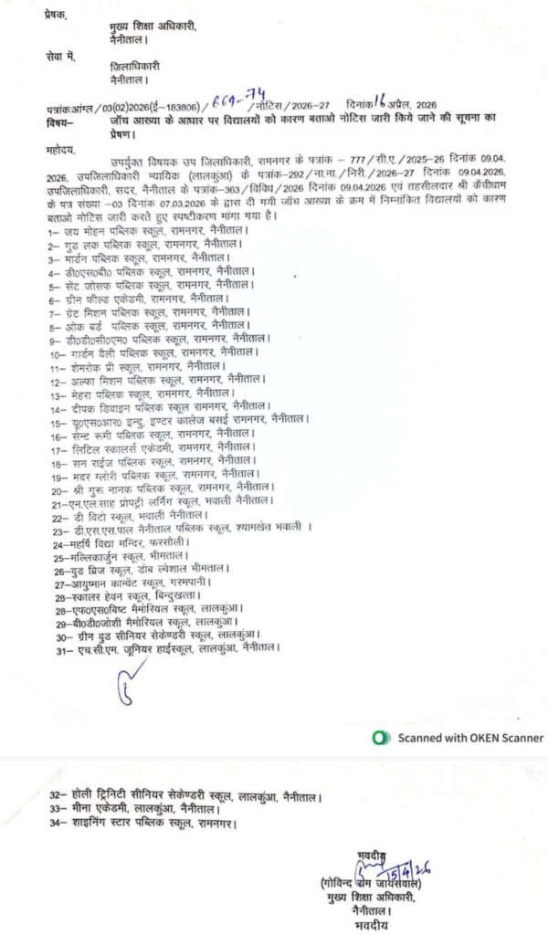 मुख्य शिक्षा अधिकारी, नैनीताल द्वारा जारी विज्ञप्ति के अनुसार उप जिलाधिकारियों की जांच रिपोर्ट के आधार पर संबंधित विद्यालयों से विभिन्न अनियमितताओं को लेकर स्पष्टीकरण मांगा गया है। प्रशासन ने साफ किया है कि निर्धारित समय में संतोषजनक जवाब न मिलने पर आगे की कड़ी कार्रवाई की जाएगी।