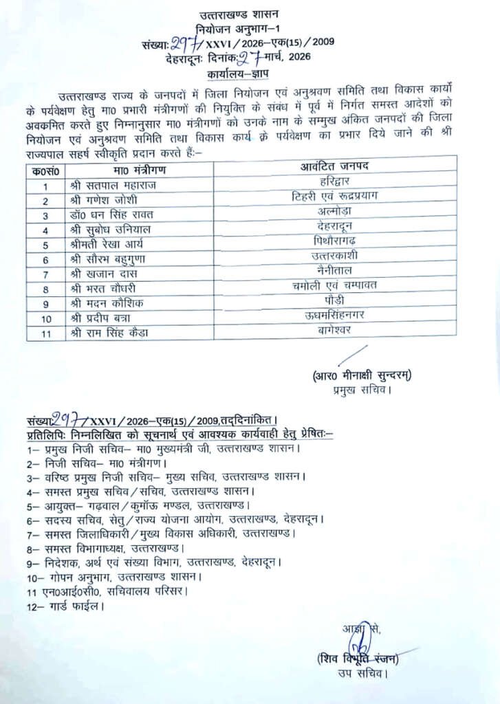 समाचार सच, देहरादून। उत्तराखंड में विकास कार्यों की निगरानी को लेकर धामी सरकार ने बड़ा प्रशासनिक फैसला लिया है। राज्य सरकार ने अपने 11 मंत्रियों को अलग-अलग जिलों की जिम्मेदारी सौंप दी है। राजभवन से मंजूरी मिलने के बाद अब ये मंत्री संबंधित जिलों में जिला नियोजन एवं अनुश्रवण समिति के माध्यम से विकास कार्यों की समीक्षा और पर्यवेक्षण करेंगे।