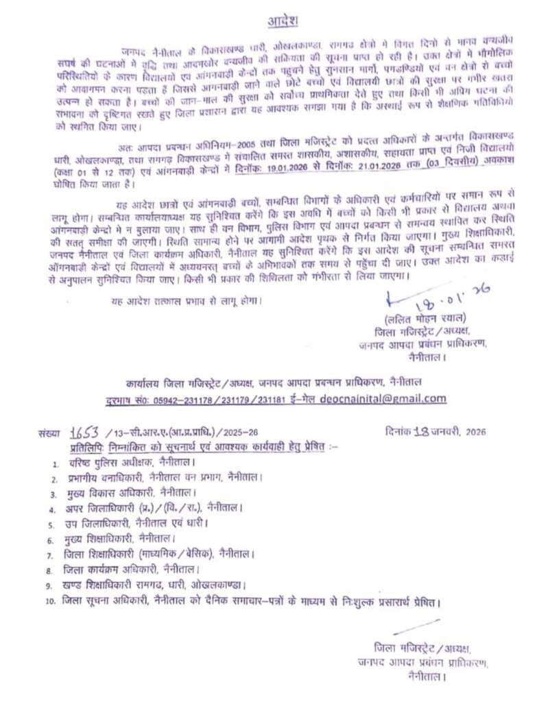मानव-वन्यजीव संघर्ष की बढ़ती घटनाओं को देखते हुए जिला प्रशासन ने बड़ा फैसला लिया है। जिलाधिकारी ललित मोहन रयाल ने धारी, ओखलकांडा और रामगढ़ विकासखंड के अंतर्गत आने वाले सभी सरकारी, सहायता प्राप्त और निजी विद्यालयों (कक्षा 1 से 12 तक) तथा आंगनबाड़ी केंद्रों में 19 से 21 जनवरी तक अवकाश घोषित कर दिया है।