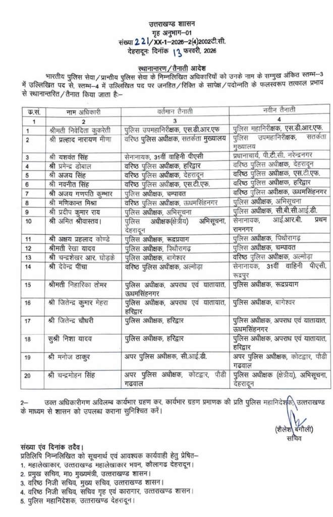 इसके अलावा नवनीत भुल्लर को हरिद्वार में नई तैनाती दी गई है। शासन स्तर से जारी आदेशों के अनुसार अन्य अधिकारियों के दायित्वों में भी बदलाव किया गया है।