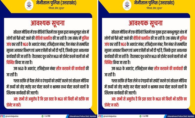 पुलिस का कहना है कि सोशल मीडिया पर एक वीडियो जिसमें कथित एनजीओ के एक युवक द्वारा बनभूलपुरा क्षेत्र में लोगों को पैसे बांटने का प्रसारण किया जा रहा है। पुलिस एनजीओ के अकाउंट नंबर, रजिस्ट्रेशन नंबर, पैन नंबर की जांच कर रही है। आयकर विभाग और अन्य एजेंसियों से जुड़ी जानकारी भी दी जा रही है। जिसके जरिए आवश्यक कार्रवाई की जा रही है।