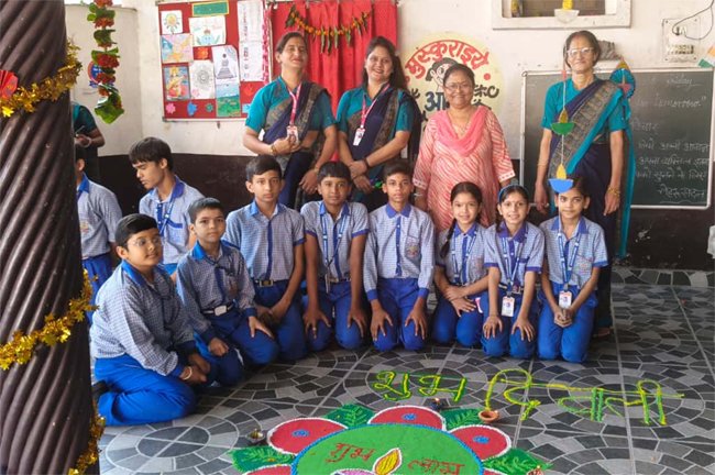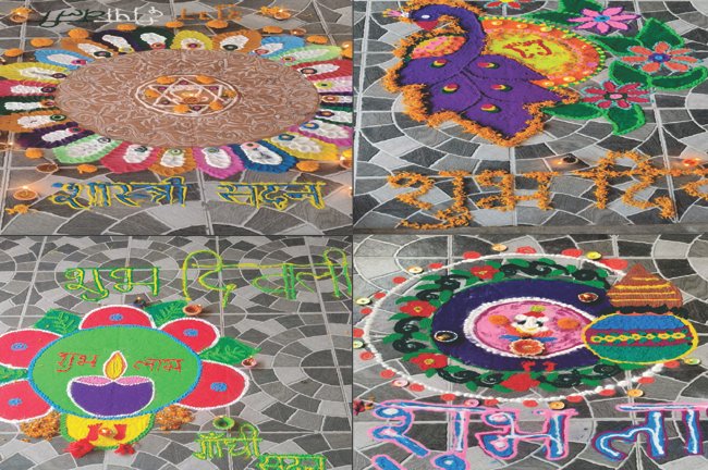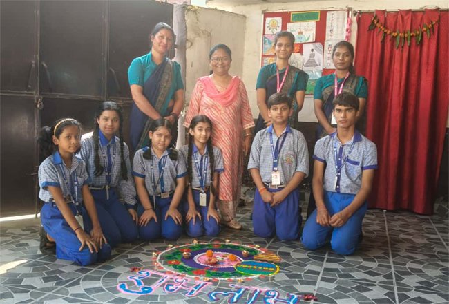 गाँधी सदन के विद्यार्थियों ने रंग-बिरंगे दीपक और फूलों की सुंदर रंगोली बनाई, वहीं नेहरू सदन ने गणेश जी और शुभ कलश का मनमोहक चित्र उकेरा। शास्त्री सदन ने पारंपरिक शैली में गेरू और विश्वार (चावल के आटे का चूरा) से सनातन रंगोली एपण बनाकर सबका ध्यान खींचा। टैगोर सदन ने सतरंगी मोर बनाकर आकर्षण का केंद्र बना।