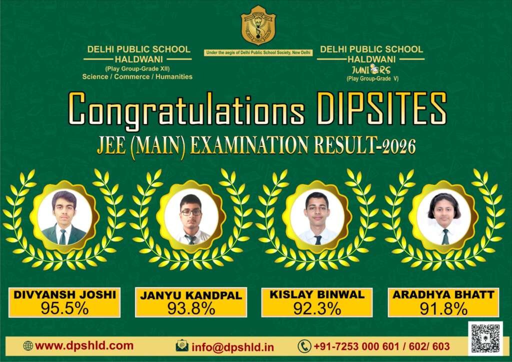 समाचार सच, हल्द्वानी। दिल्ली पब्लिक स्कूल, हल्द्वानी के विद्यार्थियों ने जेईई (मेन) 2026 में उत्कृष्ट प्रदर्शन करते हुए विद्यालय और पूरे क्षेत्र का नाम रोशन किया है। चार प्रतिभाशाली छात्रों ने उच्च प्रतिशत अंक हासिल कर यह साबित किया कि निरंतर परिश्रम, अनुशासन और गुणवत्तापूर्ण मार्गदर्शन से किसी भी लक्ष्य को प्राप्त किया जा सकता है।